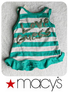 I haven't been shopping much in Macy's lately, but sometimes I come up on some great clearance items. Their baby department is great for full outfits like this Guess one. Though not pictured, it came with a matching hair bow and tights: